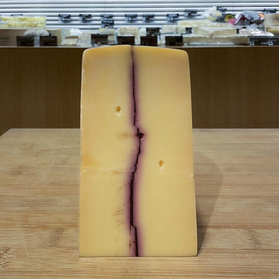 Raclette au lait cru de vache, garniture aux camerises, zestes de mandarine et graines de pavot bleu.